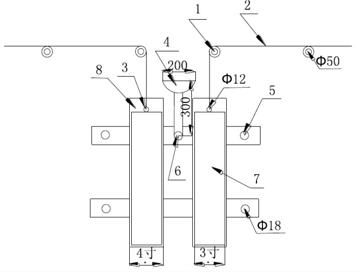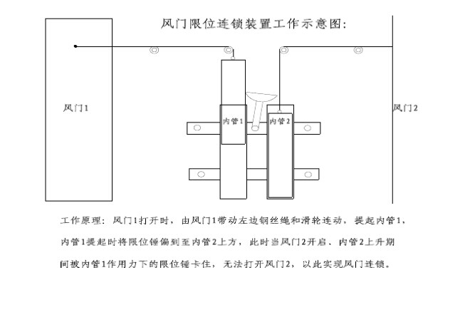 工作原理:本连锁装置是基于杠杆原理的基础上衍生创新而来的。风门连锁装置利用钢丝绳、滑轮传动,两套独立的内管由限位锤控制,用于限制两道相互连锁的风门不能同时打开。(附图)